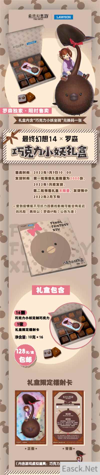 2022年1月3日至4月2日,进入罗森IP购小程序首页,即可线上购买最终幻想14×罗森联名「巧克力小妖礼盒」。 礼盒内含 “巧克力小妖坐骑”兑换码一张,数量有限,先到先得!