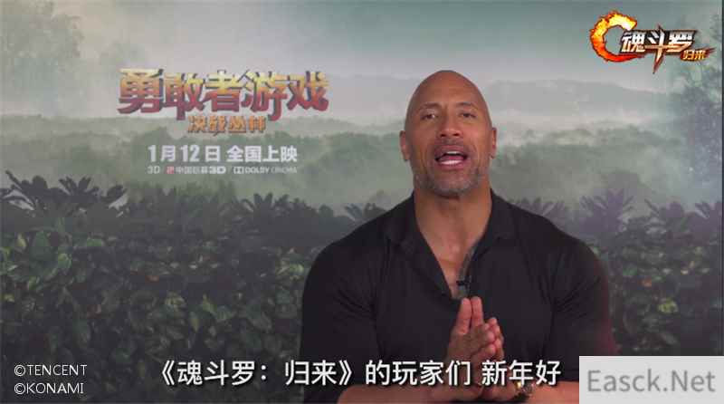 1月12日,由美国索尼哥伦比亚影片公司出品的好莱坞动作冒险巨制《勇敢者游戏:决战丛林》即将在中国各大院线上映。《魂斗罗:归来》作为索尼哥伦比亚影片公司在中国的重要合作伙伴之一,也为广大影迷、粉丝准备了海量观影好礼,邀请各位玩家为电影届与游戏届的强强合作点赞! 这次《勇敢者游戏:决战丛林》主演巨石强森来华之际,也特意为《魂斗罗:归来》的玩家送上了专属的新年礼物,特意录制视频向中国玩家问好,并提醒玩家参与到《魂斗罗:归来》2018年年度重磅赛事“燃魂战队联赛”当中,为全新的一年注入满满的正能量!