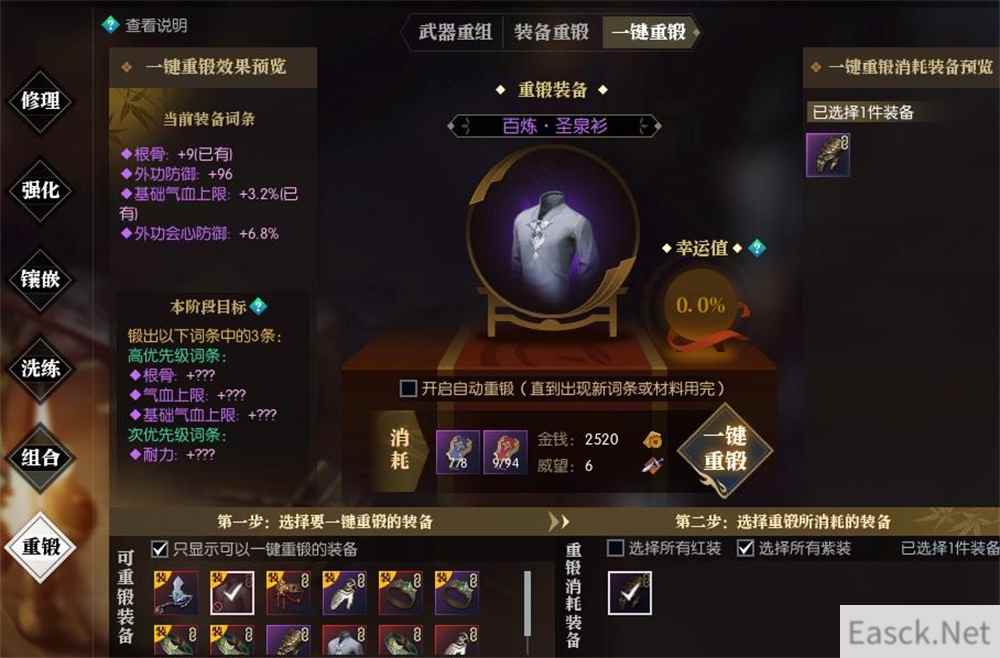 为了让萌新在刚入坑时,不被解迷般的系统绕晕。逆水寒在保留原有装备系统的基础上,推出了一键重铸玩法,萌新们只要把普通日常掉落的垃圾装备丢入天工炉,指不定就能一锤出极品装备。如果是个非酋萌新,也能靠幸运值的积累,一步一步慢慢地把装备怼成毕业装备。