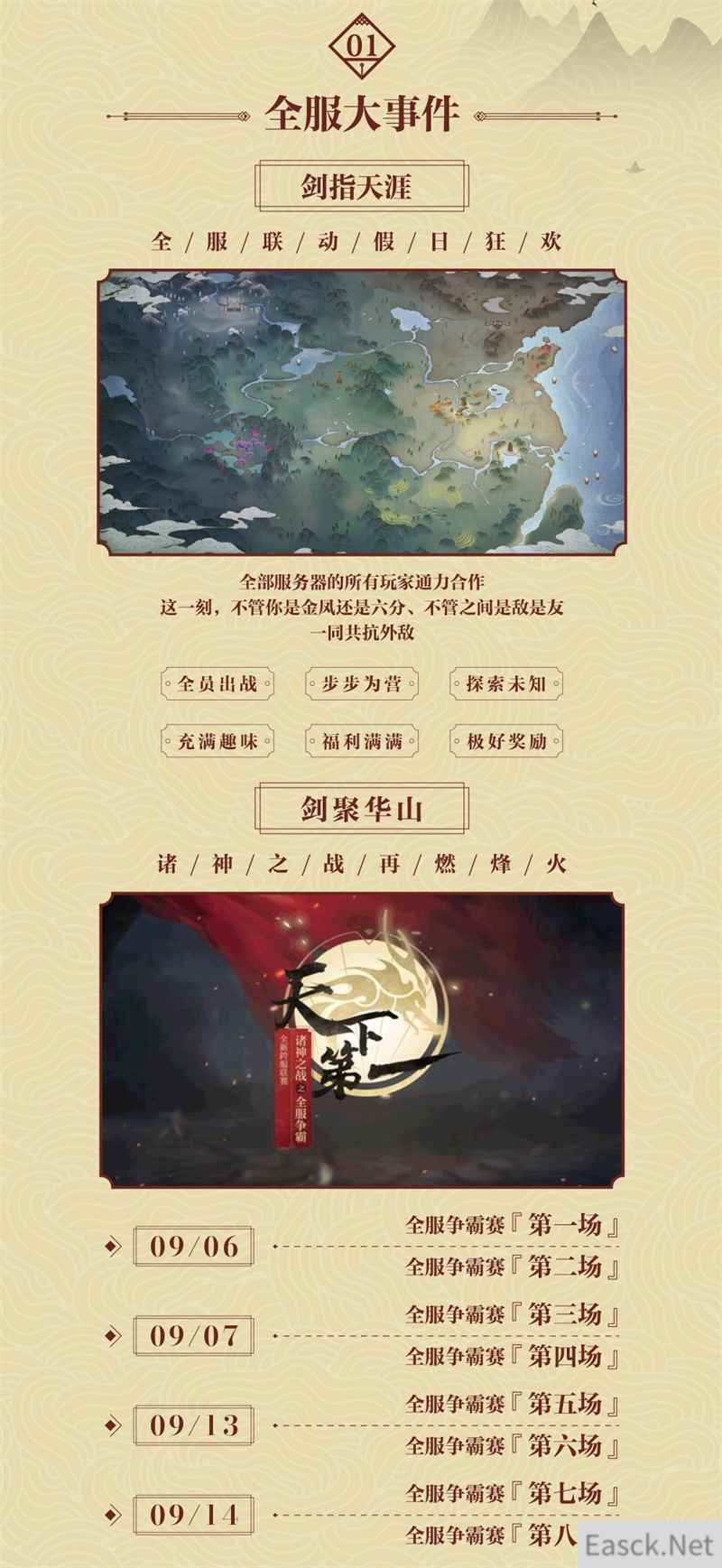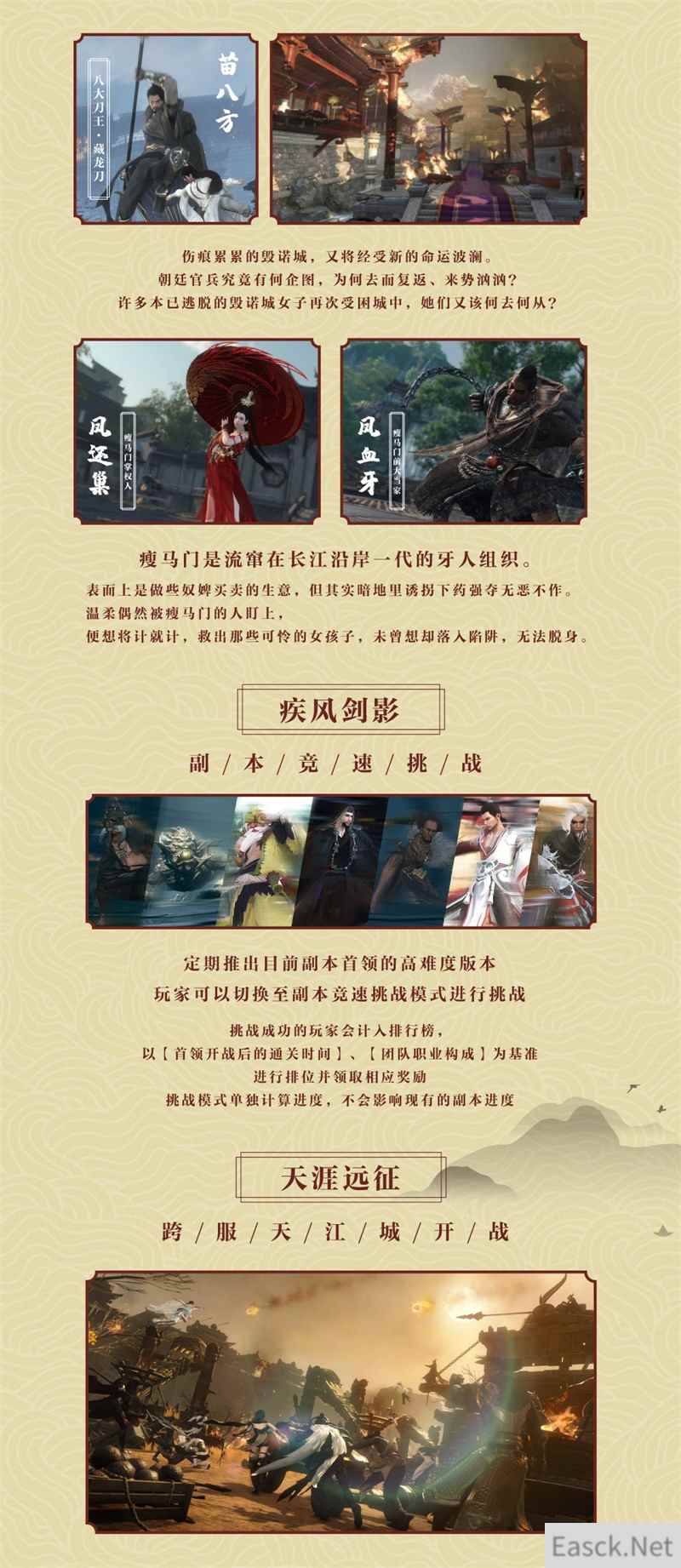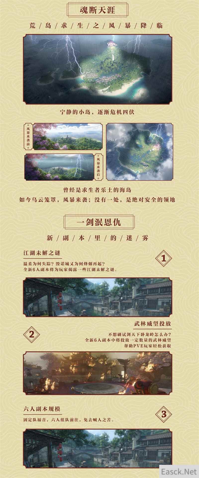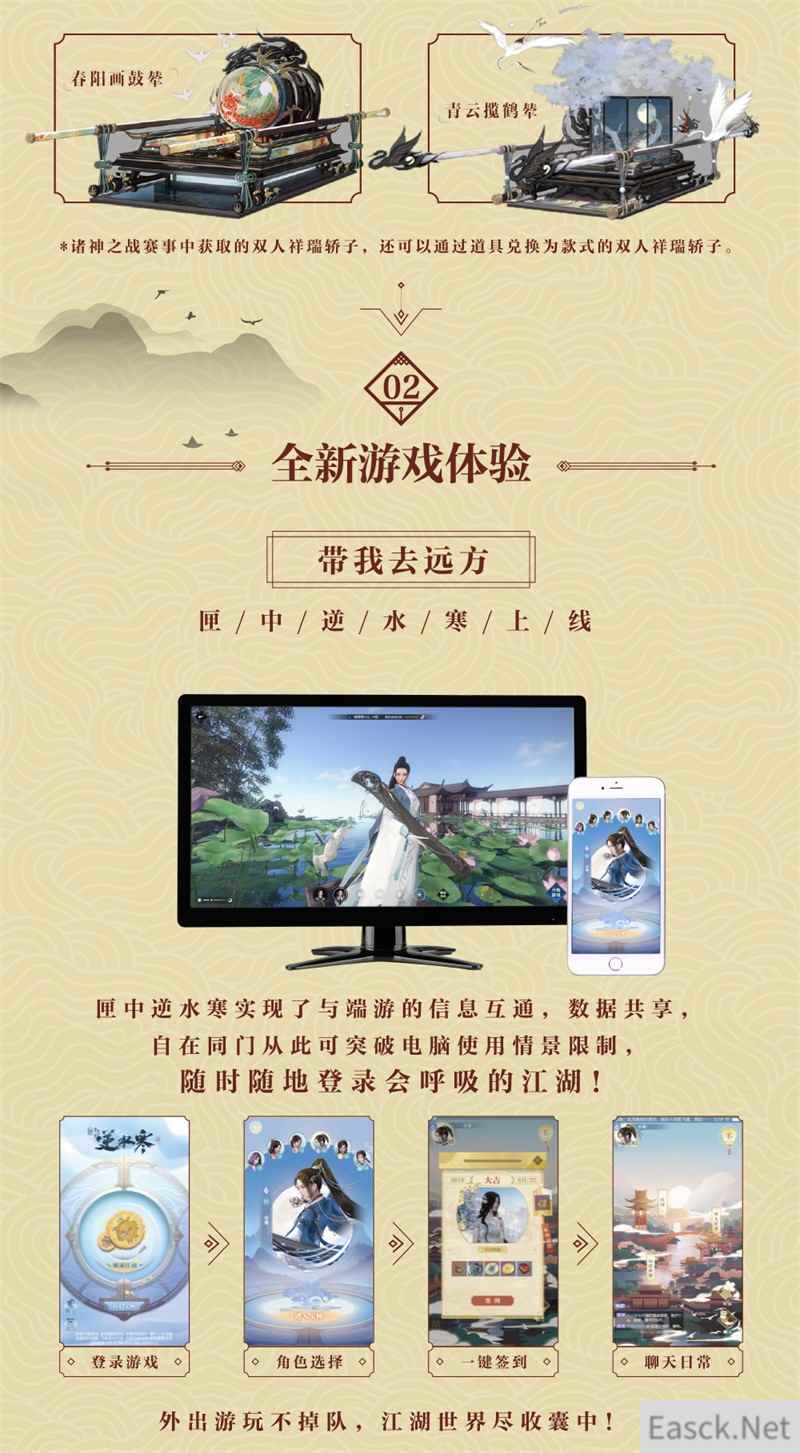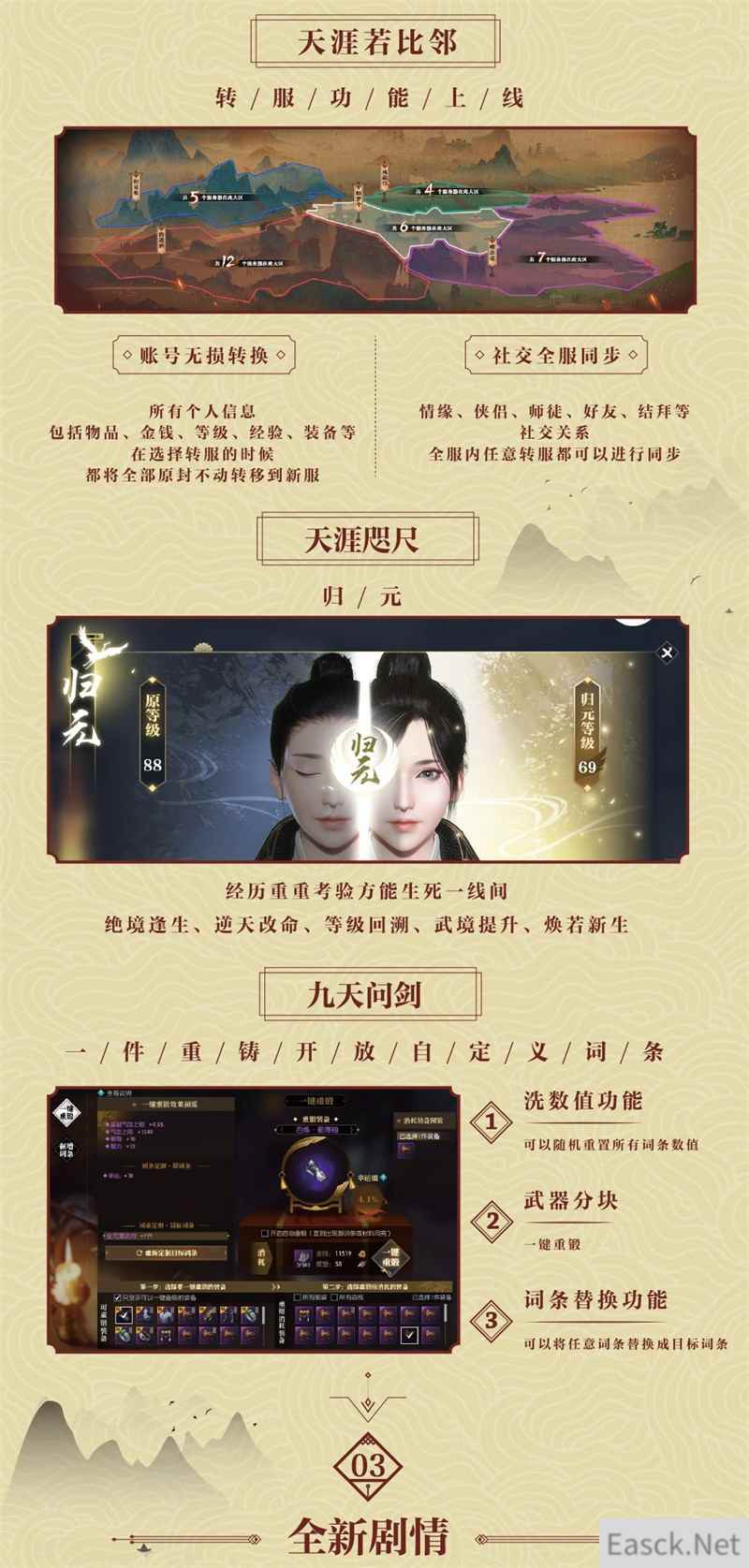本次曝光的九月版本新资料片将是以“狂欢”为主题,叫“剑与远方”,江湖不止有眼前的恩怨纷扰,还有很多宁静、美好的事情。转服系统开放后,玩家可以转到其他大区结交更多的好友。甚至于,官方开始鼓励玩家出去走一走,即使现实中在外旅游,也能通过匣中逆水寒让进度不落后于其他玩家。