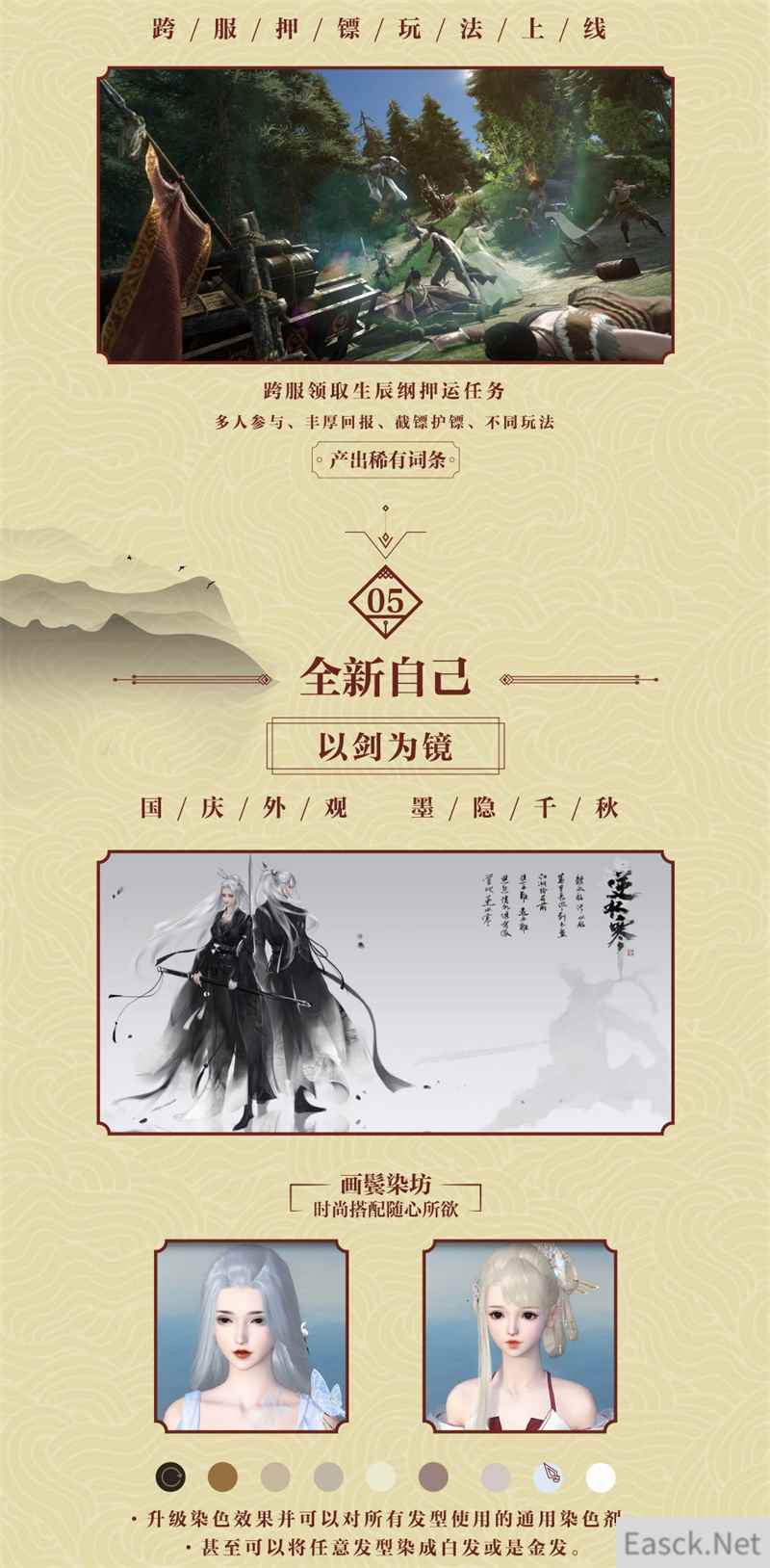 近日,逆水寒官方公布全新资料片内容,包括备受期待的荒野求生“吃鸡化” 、转服系统、匣中助手app 等,详情如下: