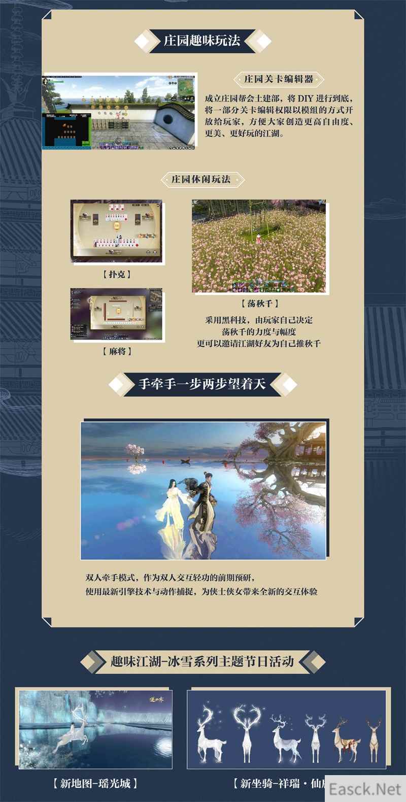 而这片全新的江湖,也在暗暗的发生着巨变:江湖身份系统将增加成员,除了出家选项之外,道士、儒生等更多身份等君选择;奇遇池扩容,旷世奇遇线索投放,俯仰之间,江湖皆有惊喜;除此之外,庄园建造自由度再升级,冰雪系列主题节日活动亟待投放。这些非数值追求玩法的加大投入,显示了逆水寒在游戏内容上继续加注、扩大研发的决心。