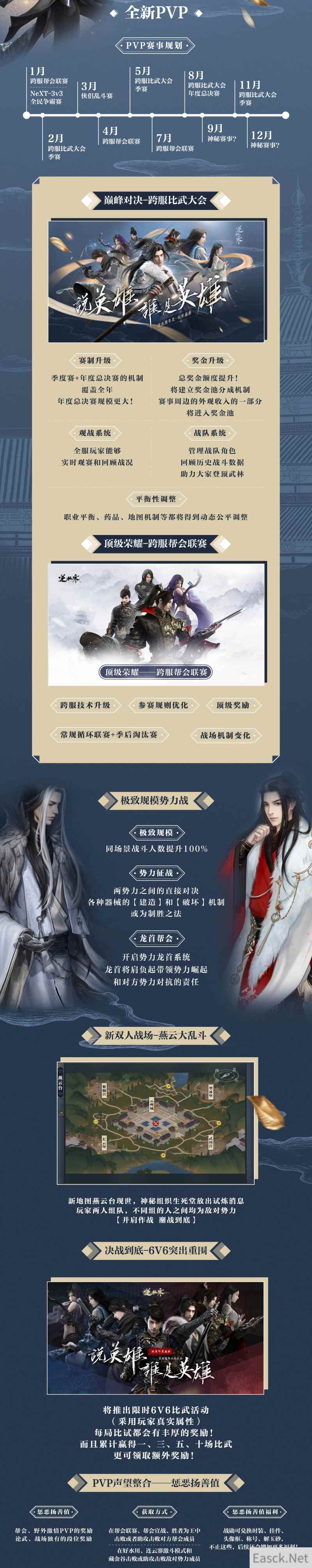 开题重点就是PVP系统的体系化丰富升级。2人组队的燕云大乱斗、6人跨服比武大会、数十人的帮派跨服联赛、万人的势力征战……不管玩家喜欢多大规模的对战,都能在战场上找到自己的节奏。而跨服对战机制、奖金额度提升、PVP声望的整合,更激发了玩家PK的动力。