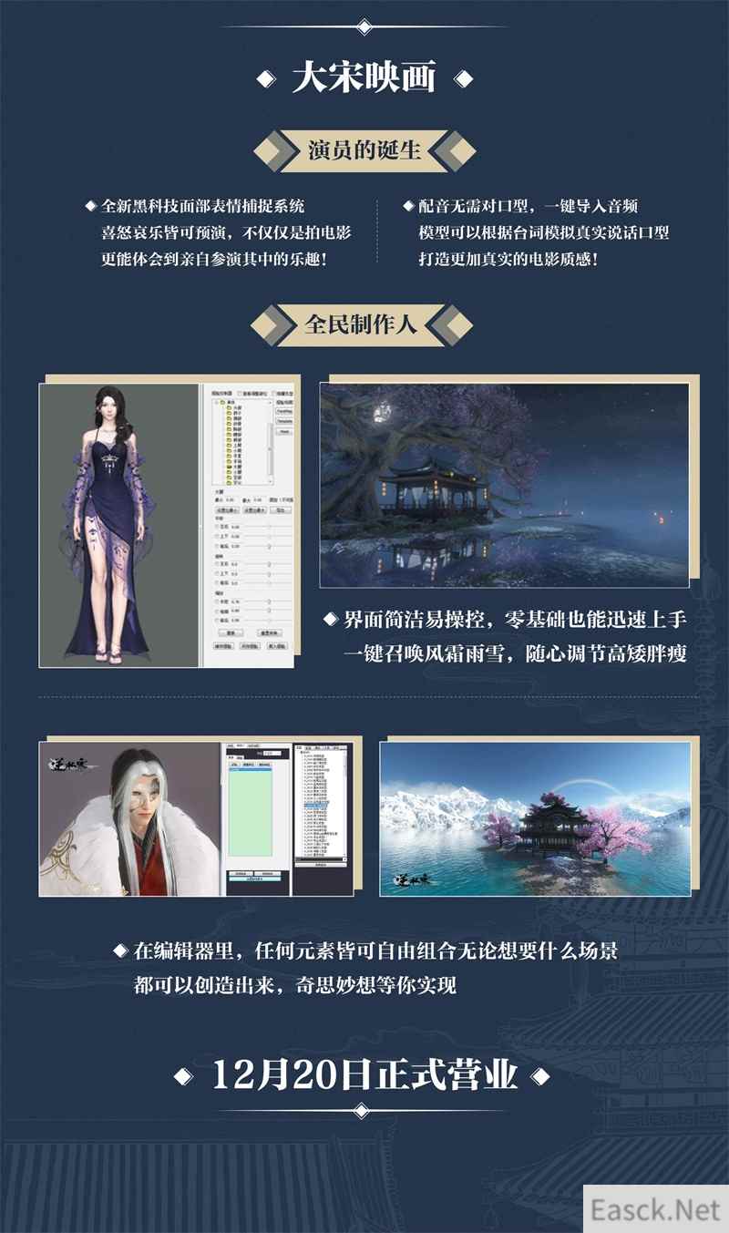 除了以上内容,《逆水寒》策划组更是带来了动画编辑器——大宋映画的全新动态,这款基于《逆水寒》游戏世界构建,为有导演梦想的玩家定制的编辑器即将在12月20日和大家在游戏中见面。全新的黑科技面部表情捕捉系统,让玩家可以亲身上阵演绎角色;更可以配音模型人物实时模拟真实口型,会呼吸的江湖自由度玩法再度突破想象力边界。