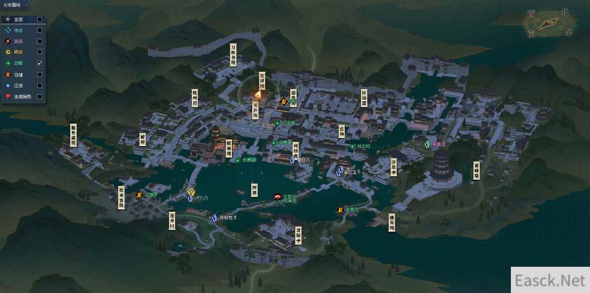 除此之外,玩家在游戏中如果用心观察,更能寻找到许多的宋文化彩蛋,汴京街头的“香饮子”、甜水巷里李师师跳的一曲《雨铃霖》,杭州知府门前供百姓击鼓鸣冤的“登闻鼓” ,乃至打开大地图时化用的宋朝名画千里江山图的青绿色调。