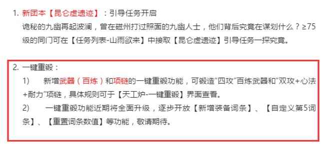 官方表示:后面还将逐步开放「装备词条」和「重置数值」等功能,让玩家在打造装备上更加的简便,进行自定义装备。 而传统重锻也没有被官方舍弃,追求极限顶级毕业装的,或者具有冒险精神的大佬,仍可以感受传统重锻带来的“刺激”和获得毕业装的成就感。 当“一键重锻”进化之后,普通玩家更容易获得毕业装备,间接性的减低了挑战Boss的难度。目前版本最强BOSS无敌公子和即将开放的昆仑墟团本,在新装备系统的加持下,相信离全民通关也不会太远了。
