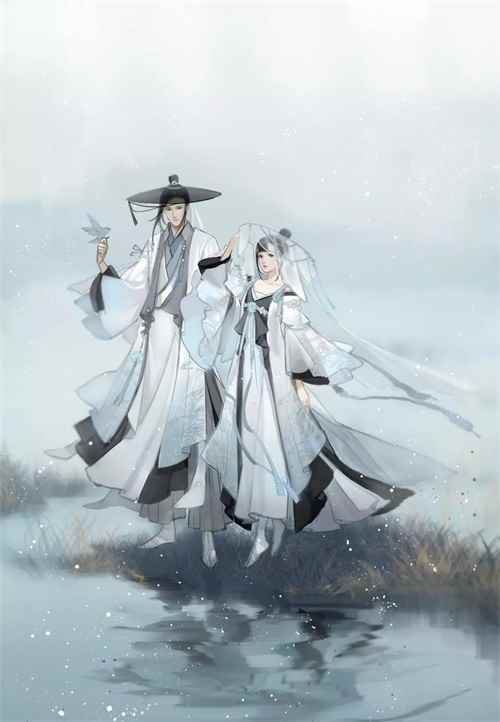 同款双色的设计,来源于清晨与黄昏时不同的芦苇丛景象。如果玩家有心的话,会发现衣摆、衣袂处皆绣上了芦苇之形,同时又辅以多层裙摆来塑造苍茫的隐士之意。整套白露时装所搭配的头饰中也加入了飞鸟意象,代表着悠然出世、无拘无束的人生态度。着此素衣,立于潇潇芦苇中,古代隐士的处世哲理,也就自在不言中了。