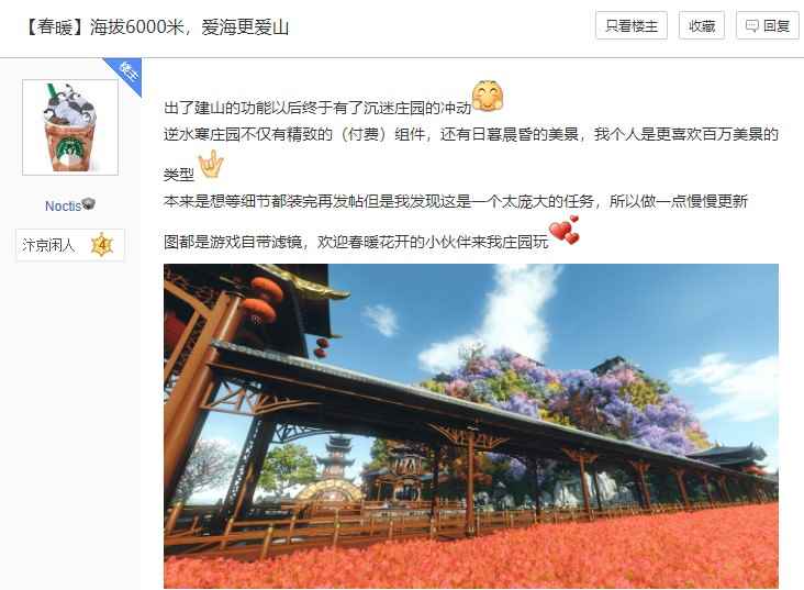 该玩家自述:因为喜欢大海喜欢山,所以想要把自己的家园建设在山顶之上。刚好趁着这次逆水寒疫情期间免点卡的福利,才有了这座美轮美奂的山峰的诞生!