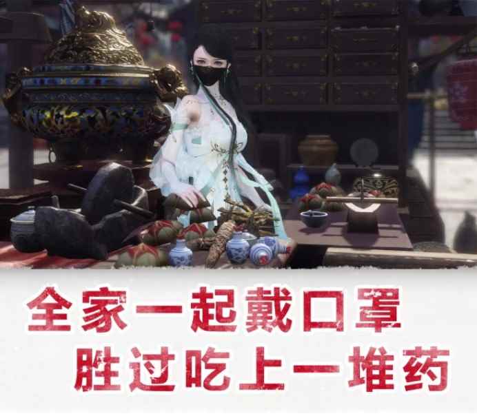 甚至还有玩家更风还原了一大批抗疫防疫土味标语,将“全家一起戴口罩,胜过吃上一堆药”、“今天一口野味,明天地府相会”等土味标语用《逆水寒》的游戏元素还原了出来,在游戏中硬核防疫!