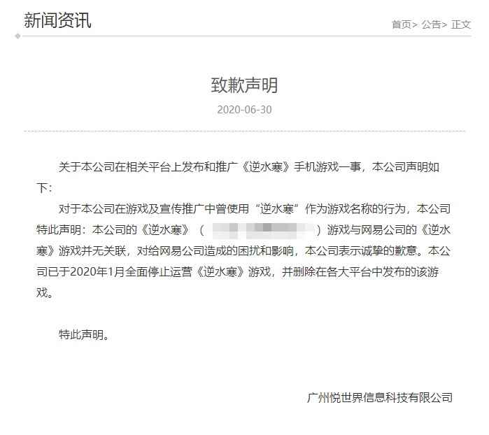 当然在万千玩家的监督下,这款“挂羊头卖狗肉”的手游没能逃过玩家的慧眼。在收集证据后,法院开庭受理此案,近日判决已经生效:认定该公司构成对《逆水寒》商标的侵权,需依据判决进行道歉赔偿。2020年6月30日,该公司在其官方网站上发布道歉声明,并表示已经于2020年1月全面停止运营商标侵权游戏,并删除了在各平台中发布的该款游戏。