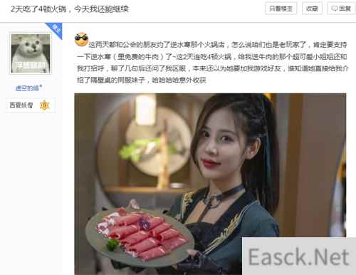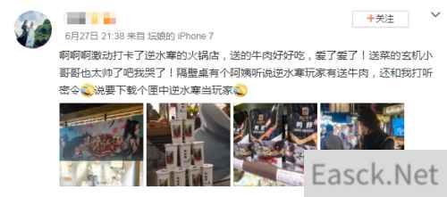 也有玩家表示自己为了支持逆水寒火锅店(的免费牛肉),而在短短2天的时间里连吃了4顿火锅,每顿都约了游戏中不同的好友一起品尝,更通过Coser服务员的介绍,结识了不少玩逆水寒的同城朋友。