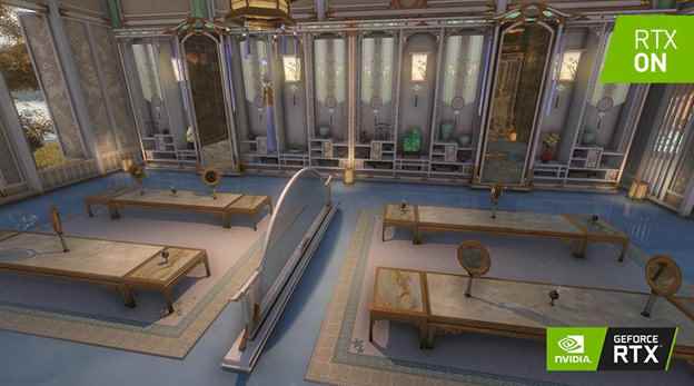 在新的专门为RTX量身定制的长庆楼场景中,RT反射效果如神来之笔,给游戏带来了前所未有的真实反射效果。玩家可以在光追效果加持的镜子中,360度无死角地欣赏羽衣霓裳在游戏角色身上的实际上身效果。