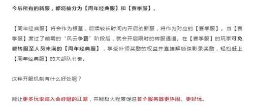 逆水寒官方公布的服务器优化计划,更是号称“申请了专利”。具体是让之后开放的新服分为【周年经典服】和【赛季服】,赛季服的玩家可以在一定条件下,可以免费转至周年经典服,这就相当于让玩家可以自由的流动于各个服务器。有了这项服务器优化后,经典服能保持持续有新玩家入驻,而新服度过前期后转入经典服平稳发育,这样就不会发生新区“鬼服”的可能。
