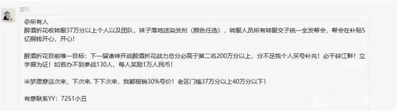 根据招兵令显示,蓝区长对外招收战力37万以上的顶级高战玩家加入团队,凡是愿意前去投奔的,蓝区长都会报销全额的转服费用,女玩家的话,还会额外赠送价值数千元人民币的高级染发剂。