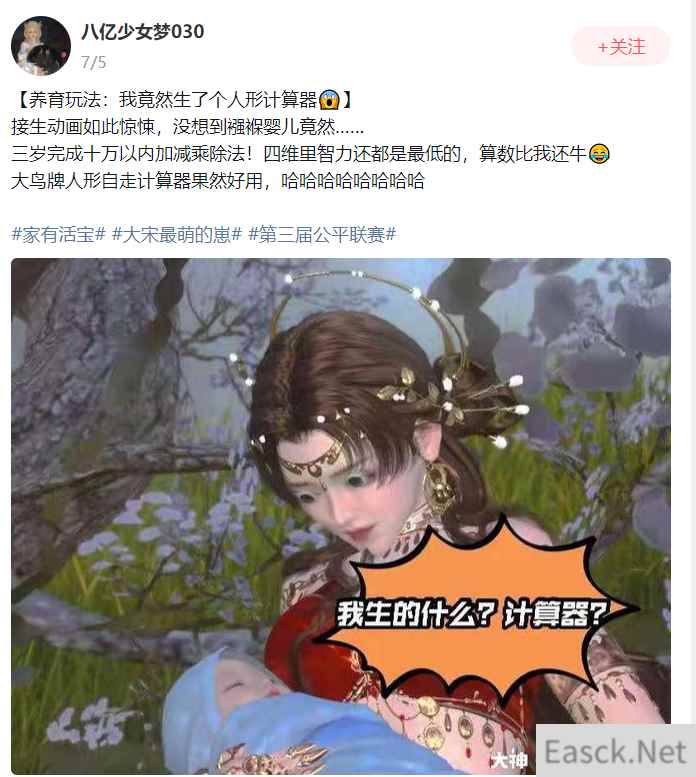 不过,在玩家们的不断探索之下,萌宝们“AI”的特征还是被逐一证实了,除了回复时间非常规律之外,有玩家还意外的发掘了萌宝的一项“技能”,那就是他们一个个都是数学小天才,算数水平出奇的高。 有玩家就表示,自己的孩子还在襁褓中,就可以帮助自己轻松的完成十万以内加减乘除的计算,堪称一个“人形自走计算器”! 就这样他的智力得分还是“四维”中最低的,简直让自己汗颜。
