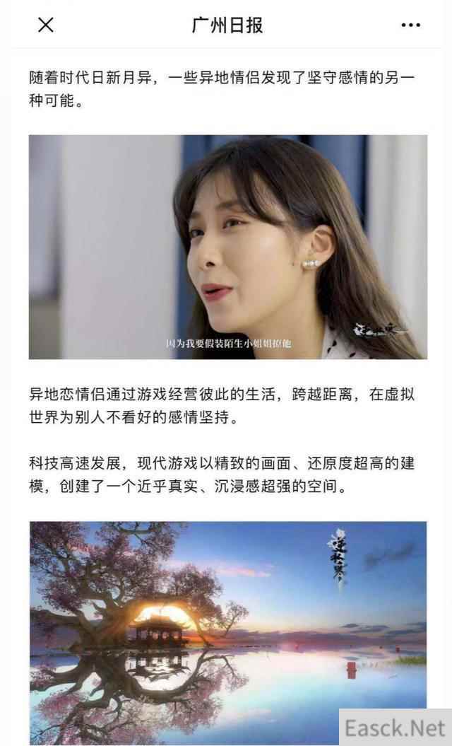 因为逆水寒网络红娘的效果太好,甚至引起了官方媒体的注意。 比如广州日报,就专门采访报道了几对因为逆水寒走向现实的情侣,他们现身说法,表示现在社会社交资源有限,通过游戏结识并了解爱好相同的异性,反倒是更加靠谱的方式,也更容易找到幸福。