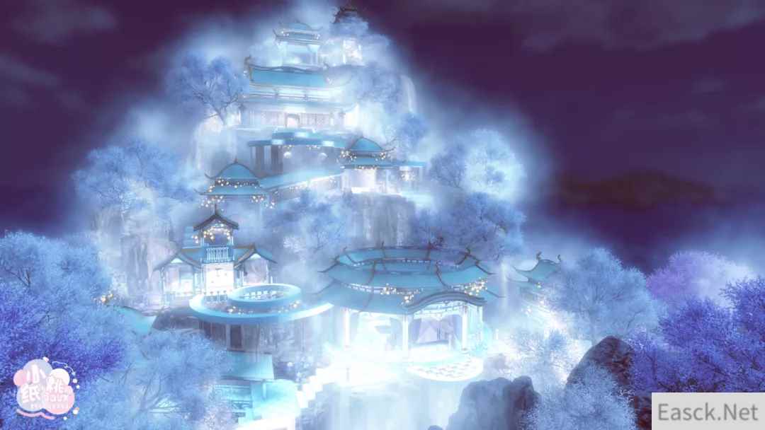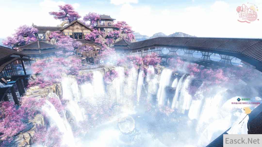 不仅如此,小桃子还把底部做成一片蝴蝶与萤火虫四散起舞的月白花海,内置一个山间朝暮亭。玩家都可以从圆盘上通过传送门下到底部花海,仰望层层瀑布、云樱,坐在亭内小憩。