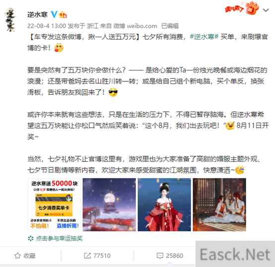 或许是看到了玩家们的大声密谋,《逆水寒》官博在七夕时直接进行了一次50000元现金的抽奖,这波操作小编是真的服了,简直把宠粉玩到了极致!