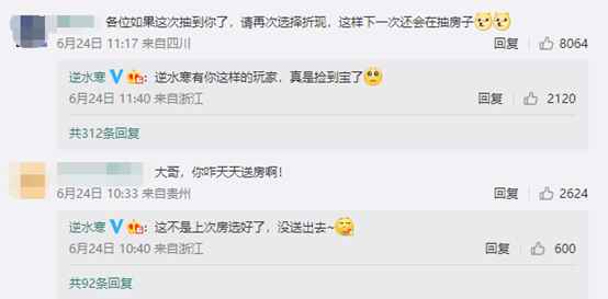 第一次送房子失败的《逆水寒》官博不甘心,于是在6月24日又双叒叕来抽奖送房了!依然是房子和现金可以二选一,但是没出意外,这次中奖的玩家还是选了现金,看来《逆水寒》官博的房子是要留在手里了。甚至有玩家想出了一个5W抽奖永动机:逆水寒官博抽房子送不出去就一直抽奖,中奖玩家一直选现金,以此达到人人白嫖5W元的美梦。