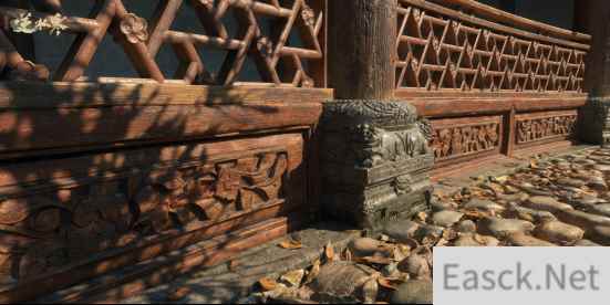 就比如说这张建筑物角落的图片,《逆水寒》就已经展示出了能和世界范围内知名厂商如“R星”、“育碧”等一较的实力了。即使是放大多倍以后,每颗鹅卵石上的花纹和光泽都有明显的差异,雕花木栏也有着相当真实的质感。
