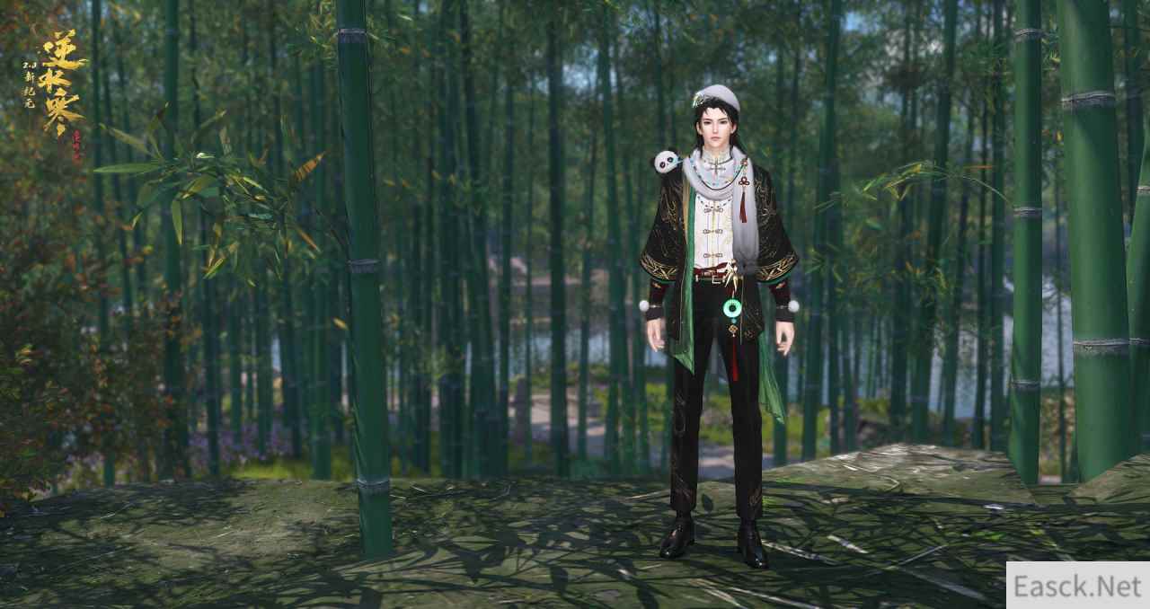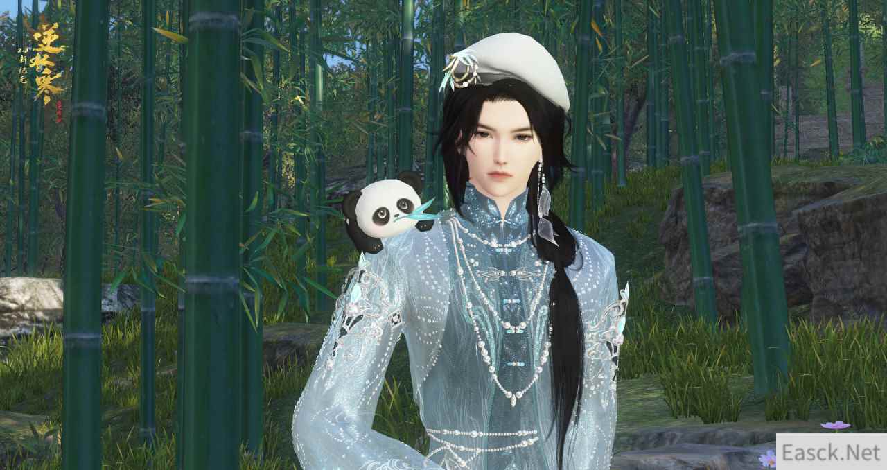 男款【竹间萌客】则走的儒雅温润路线,长衫的不规则裁剪颇为亮眼,衣衫上金丝绣纹贵气十足,但肩膀上卧趴的熊猫玩偶,又让男号多了几分可爱感。男玩家穿上,表面是气质型帅哥,内里却是热爱“吸猫”的猛男,人设反差感简直带劲。