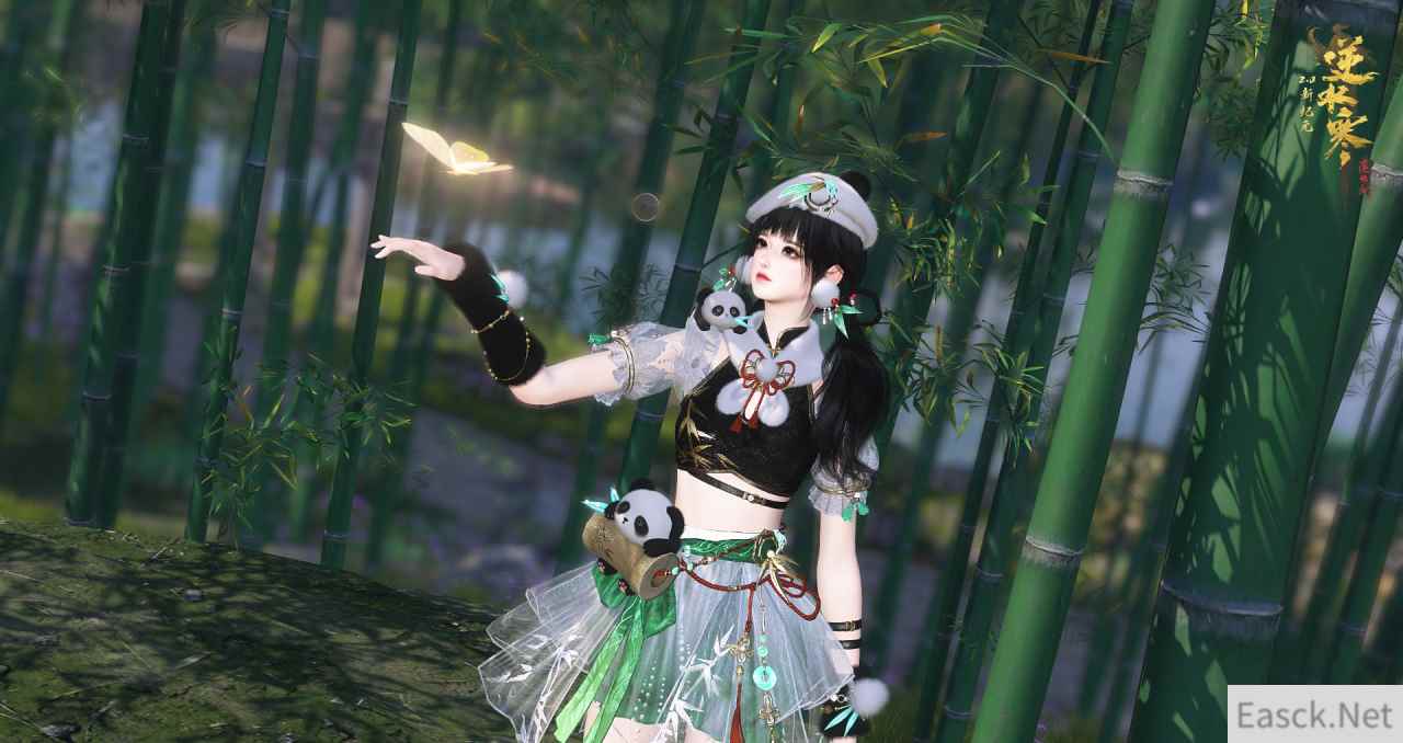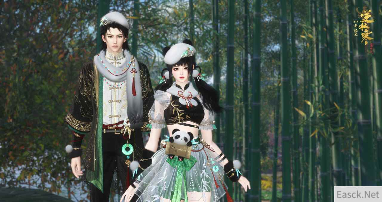 女款黑色上衣+翠绿短裙的搭配清凉俏皮,时装上点缀的金色竹叶花纹精美华贵,双马尾发型加上大熊猫腰饰、毛茸茸的护腕和腿套,让时装自带灵动气息和治愈感,女生们换上,整一个就是萌宠界女明星出门炸街!