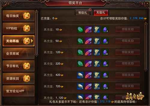 天命再临,最高价值230万元宝奖励送上 “天命再临”活动中,无论新老玩家均可认证自己战力最高的游戏角色,并根据具体战力领取奖励!各类高级材料、稀有道具等全数囊括,最高价值230万元宝的福利等你来取!满足等级等条件后,更有专属坐骑“涅槃丹凤”送上,让玩家们收获百分百回头率! 七日冲榜、无限荷包,专服活动送福利