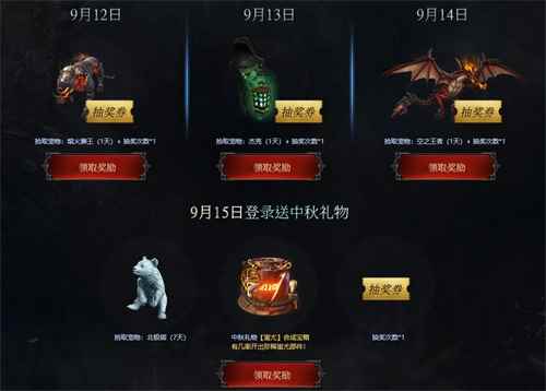 两周年暗黑狂欢祭恰逢中秋佳节,期间每日登陆即送拾取宠物,9月15日可领蚩尤合成宝箱。