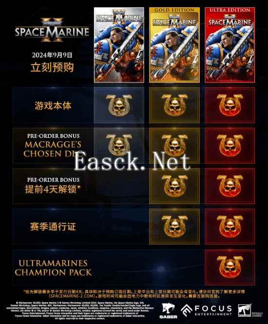 黄金版和极限版附带季票,将为玩家提供额外的装饰品,灵感来自战锤 40K世界中辉煌的星际战士战团。除季票外,在游戏发布后的几个月内,还将为所有玩家提供免费更新,增加新的任务、敌人、武器等内容。