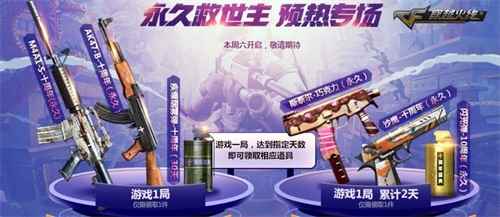 完成游戏 五款永久武器任君挑 活动期间,玩家只需要完成一局游戏,即可从M4A1-S-十周年(永久)、AK47-B-十周年(永久)以及疾爆烟雾弹-十周年(30天)中任选一件带回家;累计2天后,玩家还可以领取斯泰尔-巧克力(永久)、沙鹰-十周年(永久)、闪光弹-10周年(永久)中任意一款。五款永久武器和一款极品限定道具供玩家挑选,助力玩家畅快枪战!