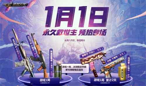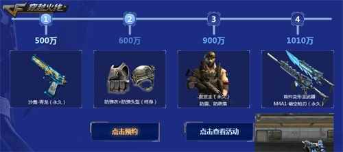预约1月1日活动 共同见证新十周年开启 既然本活动只是预热专场,那么真正的福利是什么呢?玩家在本活动页面预约1月1日元旦盛典活动,根据预约总人数,玩家将获得相应的永久道具或武器!防雷、防跌落的救世主(永久)与首件变形主武器M4A1-破空枪刃(永久)等你领取!点击“点击查看活动”按钮,玩家还可以提前一览元旦盛典活动惊喜内容。