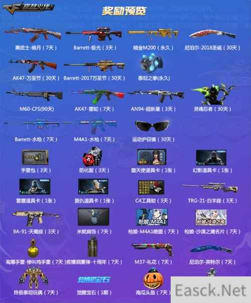 分享惊喜 豪礼赠送好友共欢喜 有福自然同享了,玩家分享活动页面给好友,即可获得源武器礼券和英雄级武器。成功赠送好友后,玩家即可获得Barrett-2017万圣节(30天)和疾爆烟雾弹-十周年(7天)。任意好友登录游戏后,玩家即可获得肥皂手雷(永久)和兔子发带(永久)。如果登录游戏的这位好友恰巧是11月1日至今都没有登陆过游戏,那么恭喜玩家了,还可额外获得青铜沙漠之鹰(永久)和薯条手雷(永久)。