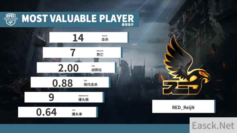 本场最佳:RED_ReijiN 本场ReijiN作为步枪手拿下了2.0的KD数据,在关键时刻拥有很强的爆发力,本场比赛中在吃闪光的情况下依旧能够依靠意识完成击杀也体现了其优秀的个人素质。