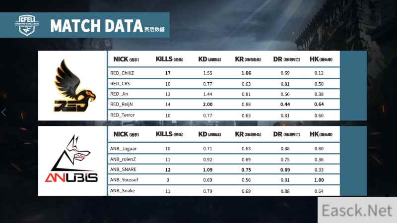 本场阵容: RED战队(REDEYES Hawks):Chillz、CRS、Jin、ReijiN、Terror ANB战队(Anubis Gaming):Jaguar、rolenZ、SNARE、Youssef、Snake