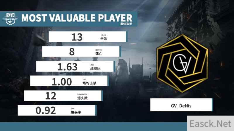 本场最佳:GV_DeNis 本场比赛DeNis的数据在全队不是最优秀的,但是在比赛中他的节奏把控非常完美,最后一局远点单发爆头更是惊艳全场。