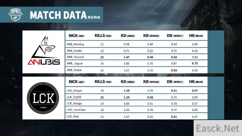 本场数据: 本场比赛ANB的Youseef和LCK的FLEXX表现非常不错,均拿下了全场最高的22个击杀,纵观整场的数据,LCK在总击杀数量上略胜一筹,战损比也略高。