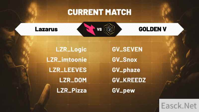 本场阵容: LZR战队(Lazarus):Logic、imtoonie、LEEVES、DOM、Pizza GV战队(Golden V):SEVEN、Snox、phaze、KREEDZ、pew