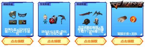 7月16日前,CFer当天游戏一局后还可以进入“萌杀补给库”选择一件补给领取,每次领取补给,都有几率获得该补给的7天版本/30天版本/无期限版本。