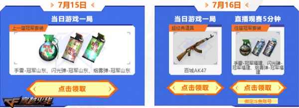 7月15日或16日当天,玩家完成任务还会有额外道具奖励,当日游戏1局即可直接领取对应奖励,CFer每天前往留言板留言、当日游戏1局或者观看百城总决赛还将获得抽奖次数,有机会抽取到火麒麟-百城 皮肤、魂·龙啸-N1CE或冠军套装补给。