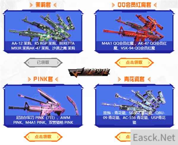 7月15日至8月6日期间,玩家每周任意游戏一局(人机、自定义除外)且CFHD等级≥3即可任选茉莉套装、QQ会员红魔套装、Pink套装或青花瓷套装等经典复刻套装领取,每套限领1次,并且每位CFer最多可领3套。