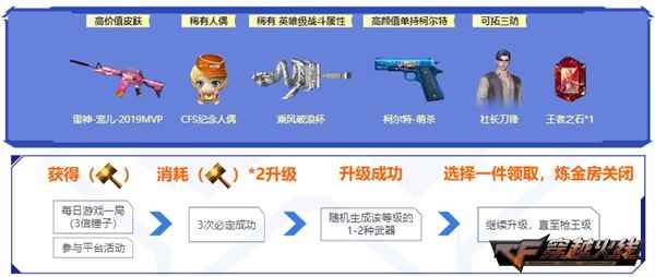 7月21日前,玩家完成任务还可获得全明星锤,消耗一定数量的全明星锤可升级武器等级,武器升级可能失败,但最多3次必定成功,而升级成功后,武器会随机生成该等级的1-2种武器,玩家可选择1种领取。