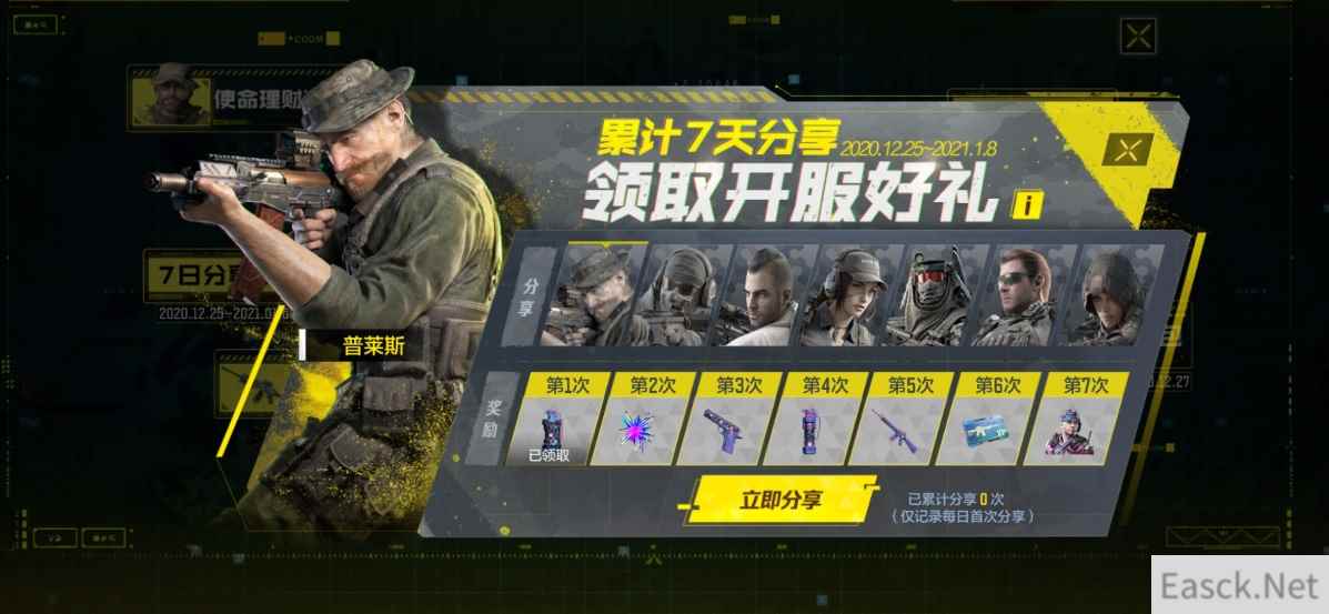 福利三:七日分享 领庆典主题奖励 活动期间,玩家分享角色海报,即可激活对应奖励,连续分享七天可解锁全部奖励。烟雾弹-庆典、贴纸-庆典、MW11-庆典、闪光弹-庆典、M16-庆典、中级武器经验卡、突击队员3号-庆典等礼品轻松得。