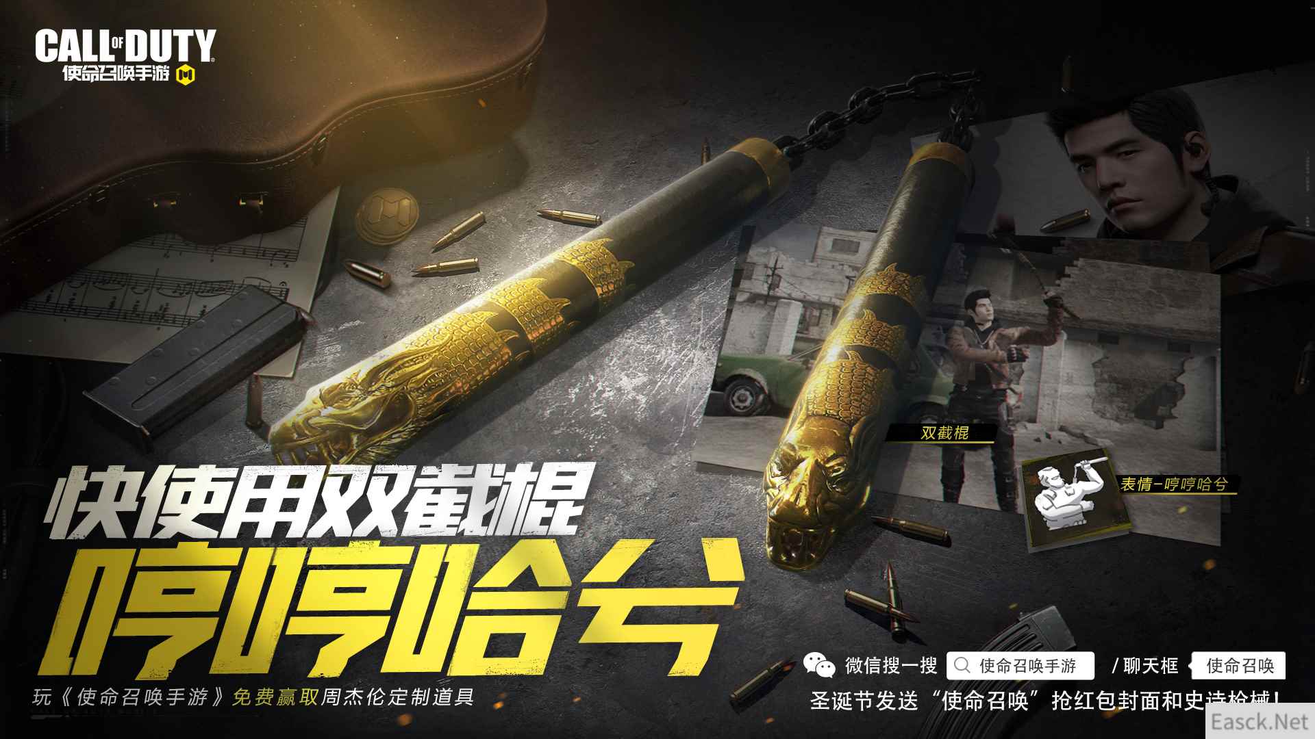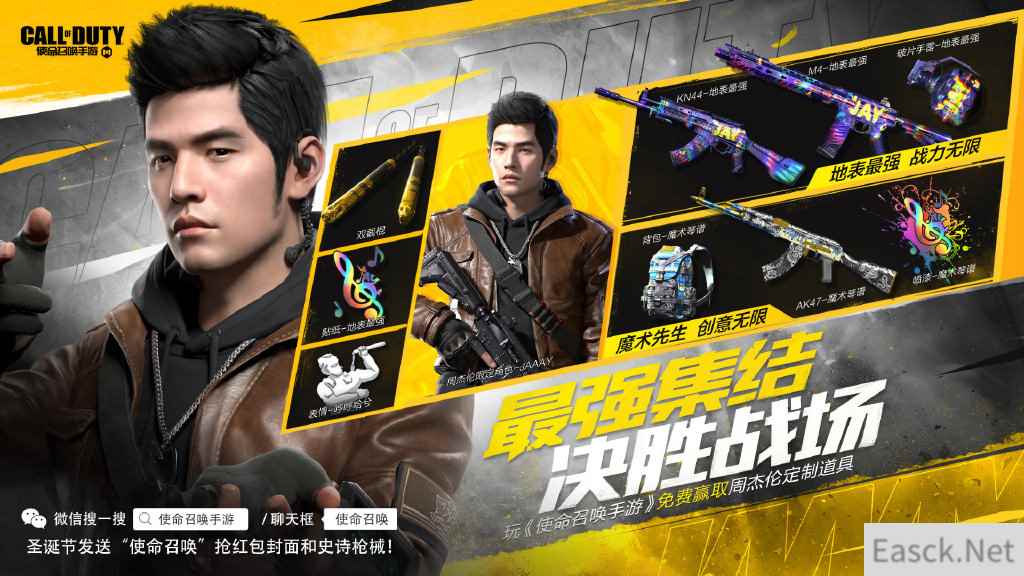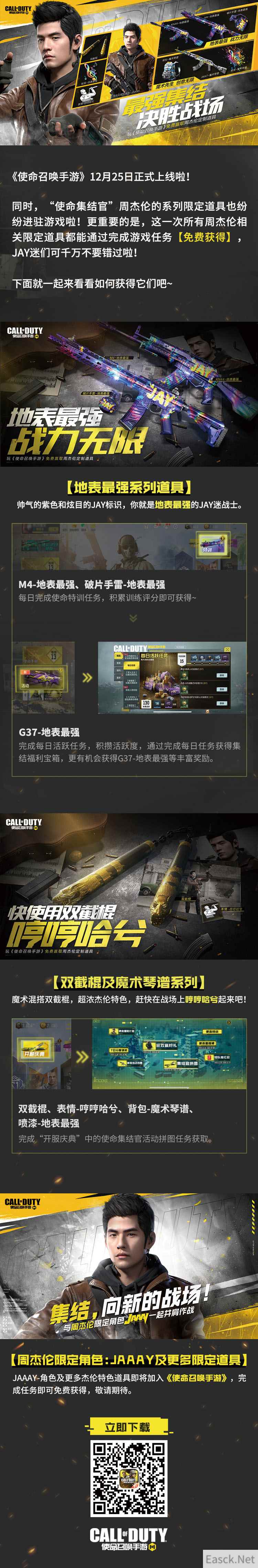 参与就送 限定道具轻松拿 为了让新加入使命战场的玩家有更好的体验,此次周杰伦系列限定道具都可以通过完成任务免费获得,千万不能错过!活动期间,玩家完成每日活跃任务,积攒活跃度,即可兑换集结福利宝箱,有机会解锁G37-地标最强等丰富奖励。完成“开服庆典”中的使命集结官活动拼图任务,即可获得双截棍、表情-哼哼哈兮、背包-魔术琴谱、喷漆-地表最强。此外,新角色“JAAAY”以及更多周杰伦特色道具即将加入CODM,完成任务即可免费获得,敬请期待!