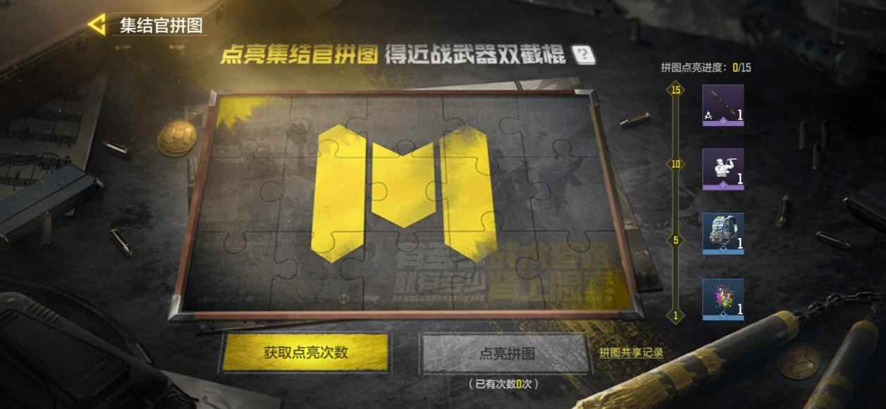福利二:参与集结官拼图 得近战武器双截棍 玩家通过收集拼图碎片可解锁对应奖励,双截棍、表情-哼哼哈兮、背包-魔术琴谱、喷漆-地表最强等道具悉数奉送。此外,拼图背后还暗藏明星彩蛋,多人匹配赛中预埋了音乐盒彩蛋,等待玩家前来发现!