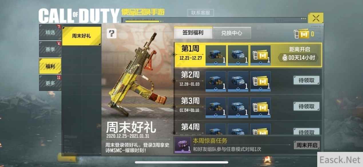 福利八:周末登录 得史诗级MSMC 周末登录游戏可以领取金币宝箱、经验卡宝箱和兑换券,周末完成任务额外赠送集结福利宝箱,集齐3张兑换券可兑换史诗级MSMC。