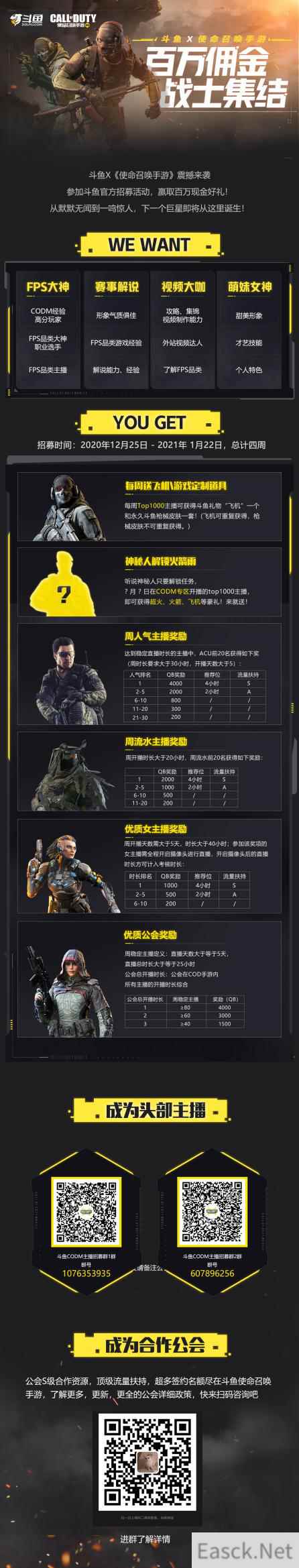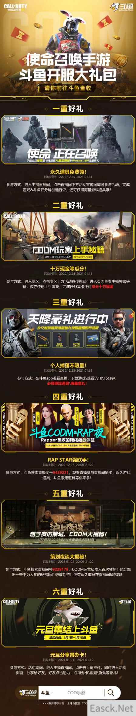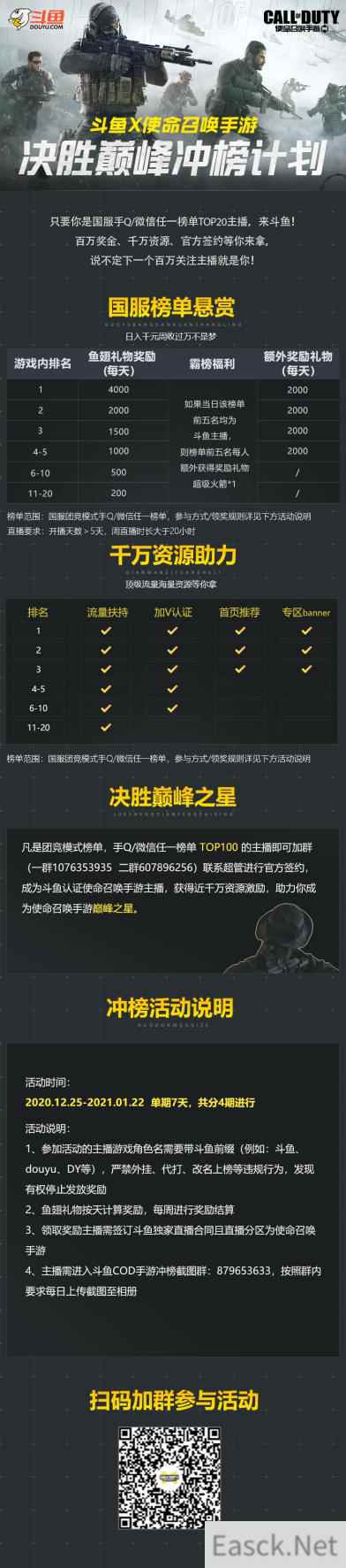 与此同时,斗鱼使命召唤手游专区将在2020年12月25日至2021年1月22日期间上线决胜巅峰冲榜计划,只要你是国服手Q/微信任一榜单TOP20主播,只要你有技术,百万奖金和千万资源等你来拿!期待你成为下一个百万关注主播!