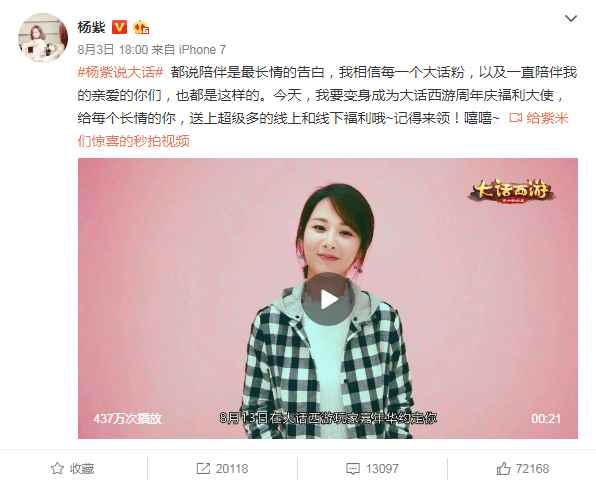 满满十五载,悠悠大话情。大话西游十五周年庆典即将到来!近日,当红小花旦杨紫微博公布了自己的新身份,将化身大话西游周年福利大使,与大话玩家相约大话西游嘉年华,并将为玩家送上多重重磅的游戏内外福利! 8月12日至13日,坐标广州,大话西游2017嘉年华邀你情义一聚,福利满满的主题游园会、热血激燃的无差别总决赛、重磅爆料的品牌发布会、高颜值的coser表演、群英荟萃的玩家颁奖仪式...一场精彩无限的线下聚会等你参与!玩家期待已久的2017版本鎏金宝鉴也将于8月10日震撼开售! 嘉年华专题链接:http://dhxy.163.com/2017/ljbj/ 长情告白 杨紫化身大话西游周年庆福利大使 和大话西游一样,不知不觉,曾经红极一时的家庭轻喜剧《家有儿女》,已经陪伴着我们度过了十数载年华,剧中“夏雪”形象深入人心,杨紫也通过自己的努力,从童星一步步蜕变成国内炙手可热的“当红花旦”。随着电视剧《欢乐颂》的持续热播,也凭借着青春靓丽的外形,再度成为观众关注的焦点。 大话西游玩家嘉年华即将来临之际,当红花旦杨紫更是首度微博发声,高调宣布出任大话西游周年庆福利大使,一番真情告白献给每一位长久陪伴在大话的粉丝们,并将在周年庆期间为玩家送上最为重磅的线上及线下福利!