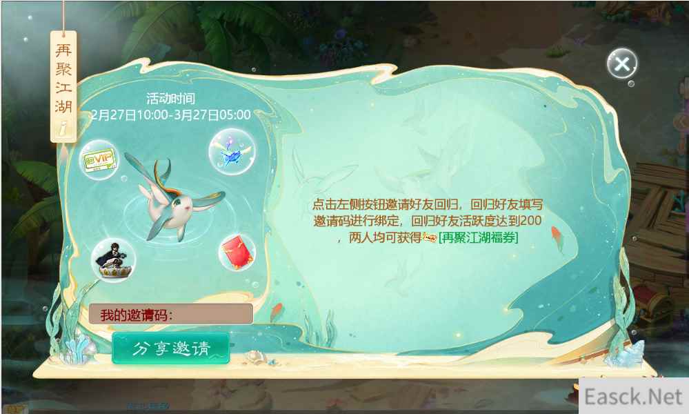 好友在接受邀请回归之后并前往“再聚江湖”活动界面填写回流邀请码后,只要回归好友活跃度达到200,绑定关系的双方均可获得“回归奖券”一张,可抽取“飞鱼灵魄”、祭剑魂手办、100、50、20、10元现金红包,爱奇艺会员卡,游戏道具等丰富好礼!