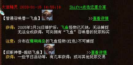 后来各种宝宝眼花缭乱,修罗雷鸟猴精取代了飞鱼在我宠物栏里的位置,也很少再看见有人带飞鱼了。 但是在做天的时候,高级飞鱼由于血厚而且治疗起来费用极低,我又赶时髦合了一个新的,这只高级飞鱼陪伴我又度过了很长时间,直到我不再做天,我又把它放生了。 渐渐的,大家的等级上来了,装备上来了,飞鱼也退出了历史的舞台,好像我也真的不再需要它了。在2005年,飞鱼彻底和我们告别了。