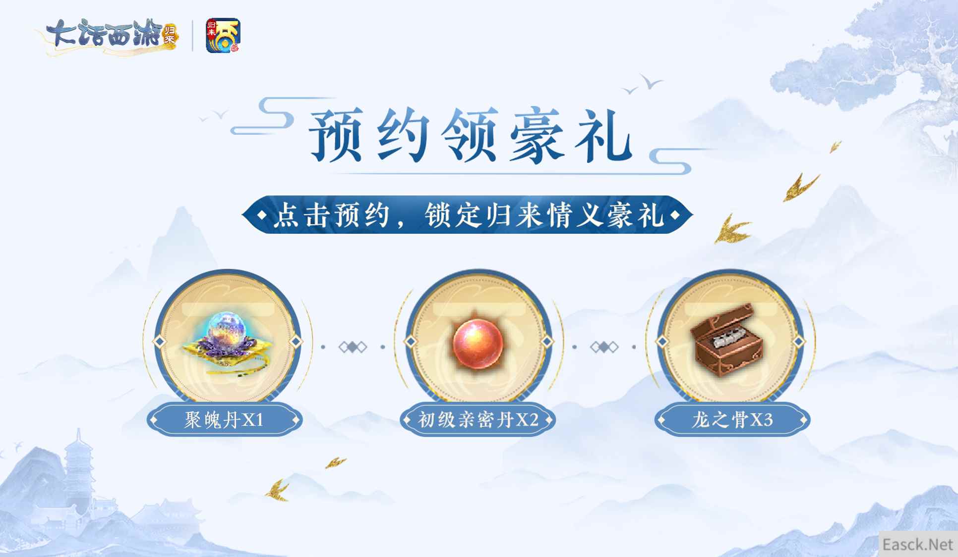与端手游不同,《大话西游:归来》进行了系列爆爽升级!迷你游戏包带领玩家秒开西游世界,随时随地开启三界之旅。全新放置挂机玩法,让玩家感受排兵布阵、运筹帷幄的快感的同时,更有飞升开局、登录就送VIP5、上线即领金色神兽,实现一键飞升、轻松获取海量福利!还有金装神宠轻松满级,感受刀刀暴击、快速超神的快感! 【预约开启 ,抢先预约享豪礼】 即日起《大话西游:归来》预约抢先开启,现在参与预约并成功的玩家除了在预约后,可第一时间获取游戏一手消息之外,更将在都将在游戏公测时获豪华预约礼包一份!内含丰厚的游戏道具奖励,包括:聚魄丹*1、初级亲密丹*2、龙之骨*3。
